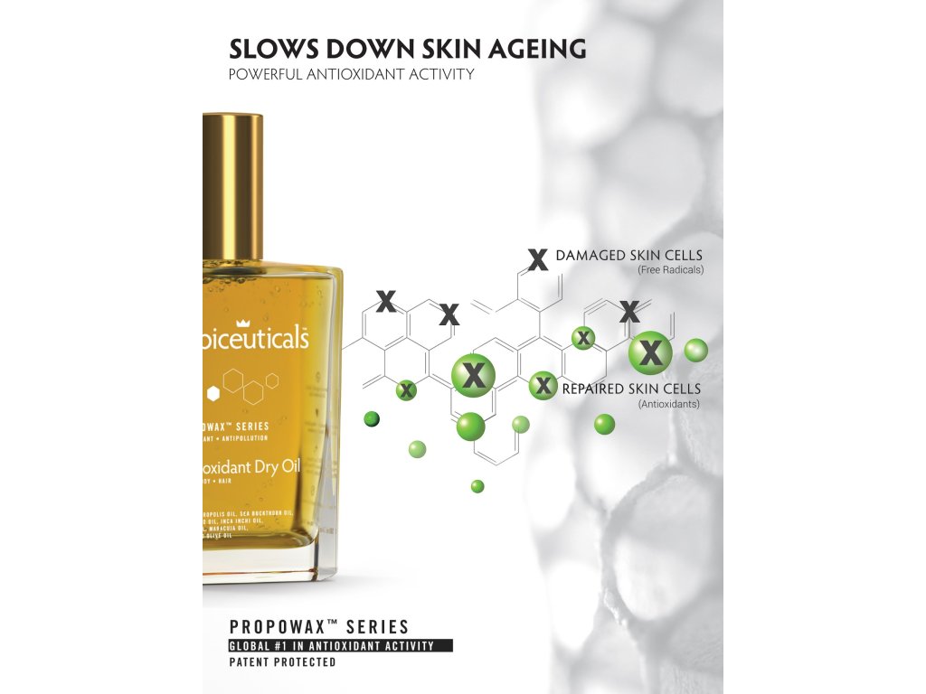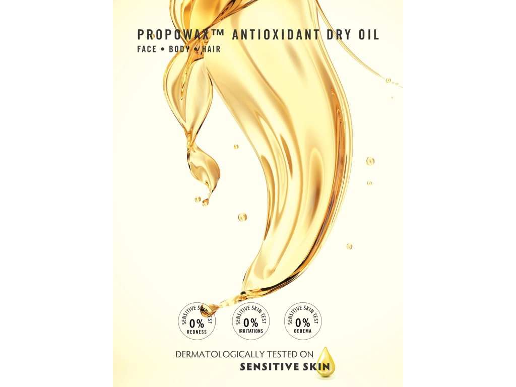 Das PROPOWAX™ Antioxidative Trockenöl ist ein vielseitiger Elixier für Gesicht, Körper und Haare. Die luxuriöse Mischung aus 7 wertvollen Ölen bietet starken antioxidativen Schutz und stellt gleichzeitig Geschmeidigkeit und Strahlkraft wieder her. Wirklich „trocken“ zieht es innerhalb von Sekunden ein und pflegt tiefgehend, ohne jeglichen fettigen Rückstand zu hinterlassen. Ihre Haut wird samtweich, elastisch und umhüllt von dem ultra-luxuriösen Duft „Woods of Arcadia“ von Apiceuticals.