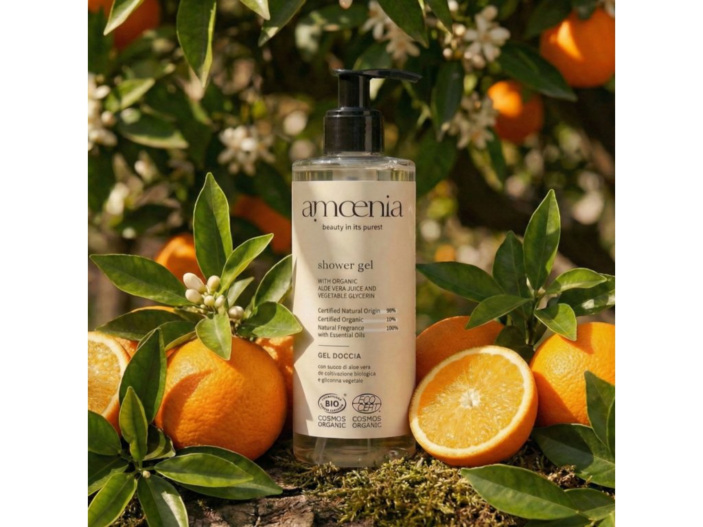 AMOENIA Duschgel 300 ml mit Pumpspender wird aus Bio-Aloe-Vera-Saft und pflanzlichem Glycerin hergestellt. Es hat beruhigende, feuchtigkeitsspendende und antioxidative Eigenschaften, reinigt und pflegt den Körper und macht die Haut weich und samtig.