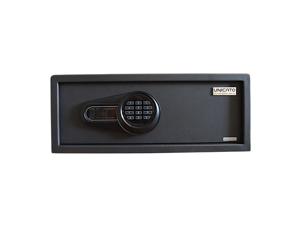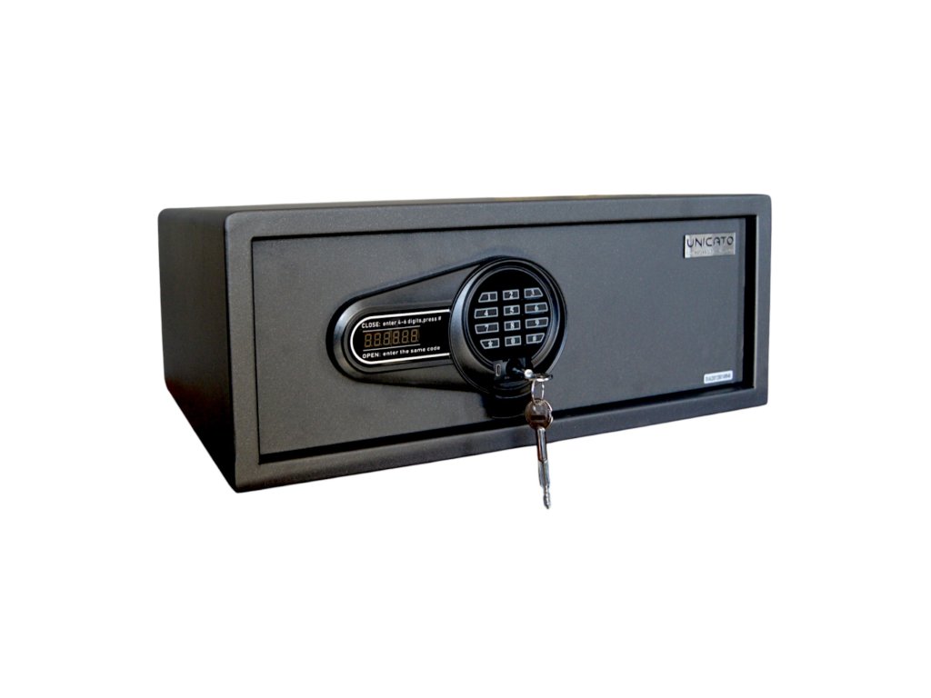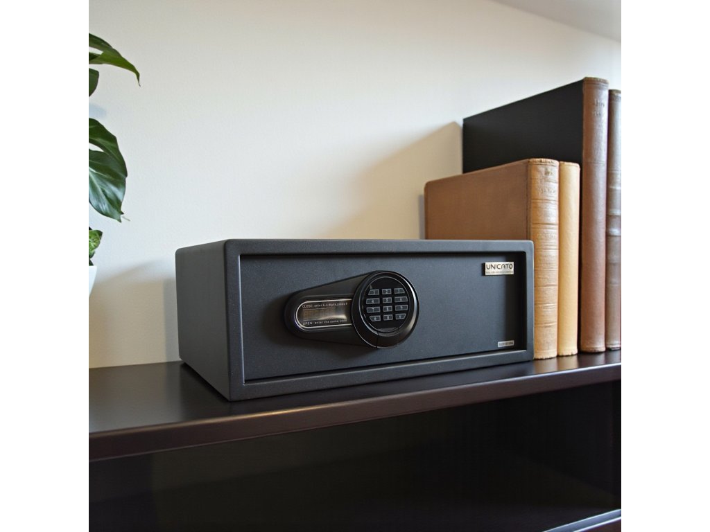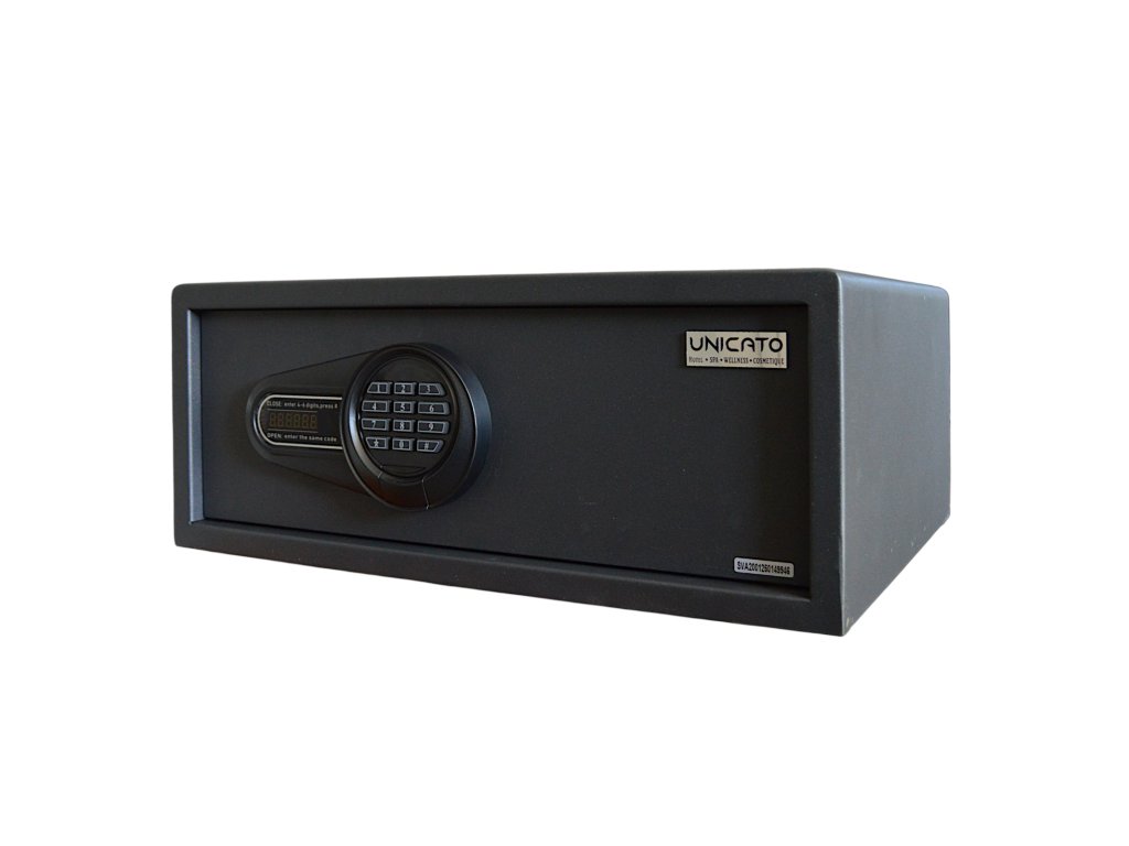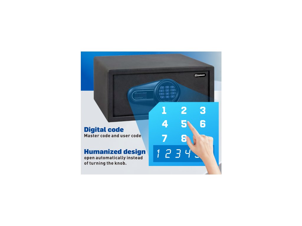 Der HAMAL Hoteltresor eignet sich für jedes Zimmer, Büro oder Zuhause. Die Codes sind einfach zu programmieren, und die digitale Tastatur ermöglicht den einfachen Zugriff auf den Tresor mit Benutzer- oder Mastercode. Ideal für häufig wechselnde Benutzer (Hotelgäste).