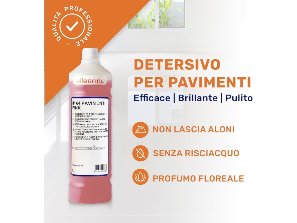 Die Verwendung von IP 64 PAVIMENTI PINK eignet sich besonders zum Reinigen von Oberflächen ohne Abspülen. Wenn Sie Haustiere haben, ist es sehr nützlich, den Boden und die Umgebung immer sauber und wohlriechend zu halten.