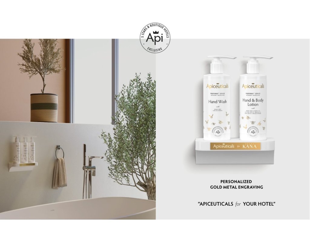 Steigern Sie das Gästeerlebnis: Die luxuriöse Kosmetiklinie von APICEUTICALS stärkt das Markenimage Ihres Hotels. Sie fördert den Produktabsatz und steigert den Umsatz. Mit Markenetiketten und gravierten Goldplaketten wird Ihr Hotel mehr als nur eine Unterkunft – es ist ein Statement. Beeindrucken Sie Ihre Gäste mit der faszinierenden Geschichte der Bienen. Die Geschichte wird durch eindrucksvolle Designs präsentiert, die sich an das Ambiente jedes Hotels anpassen lassen.